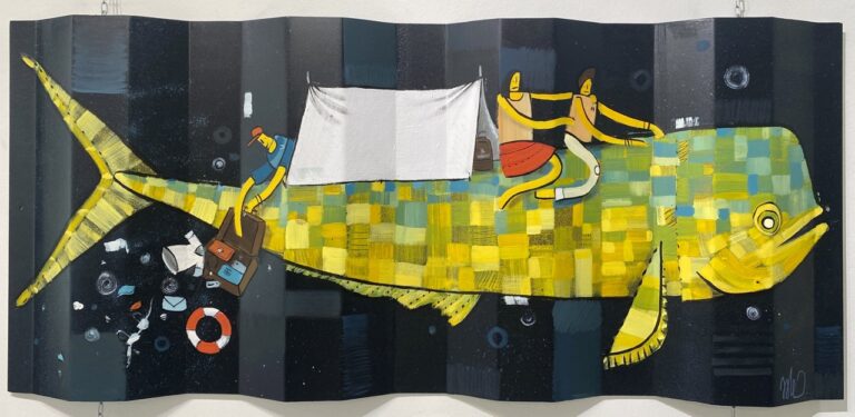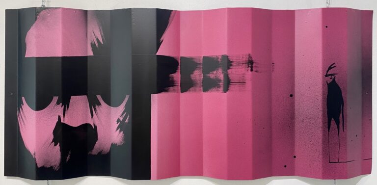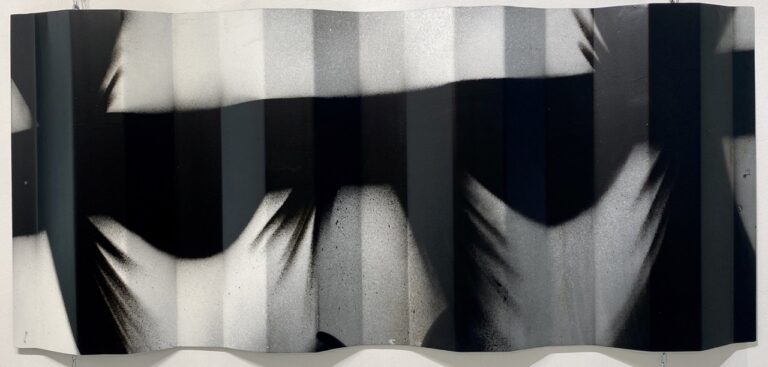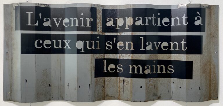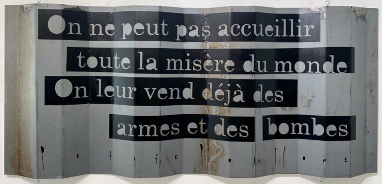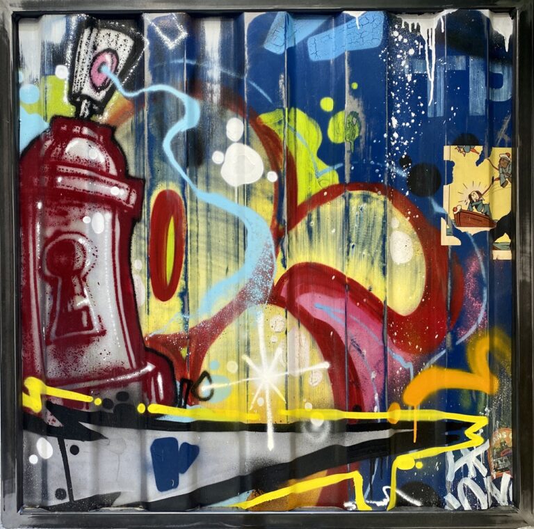 Pour cette exposition, la toile est troquée par de véritables morceaux de tôle de container : un support urbain, inédit et exclusif que la galerie a fourni à ses artistes.