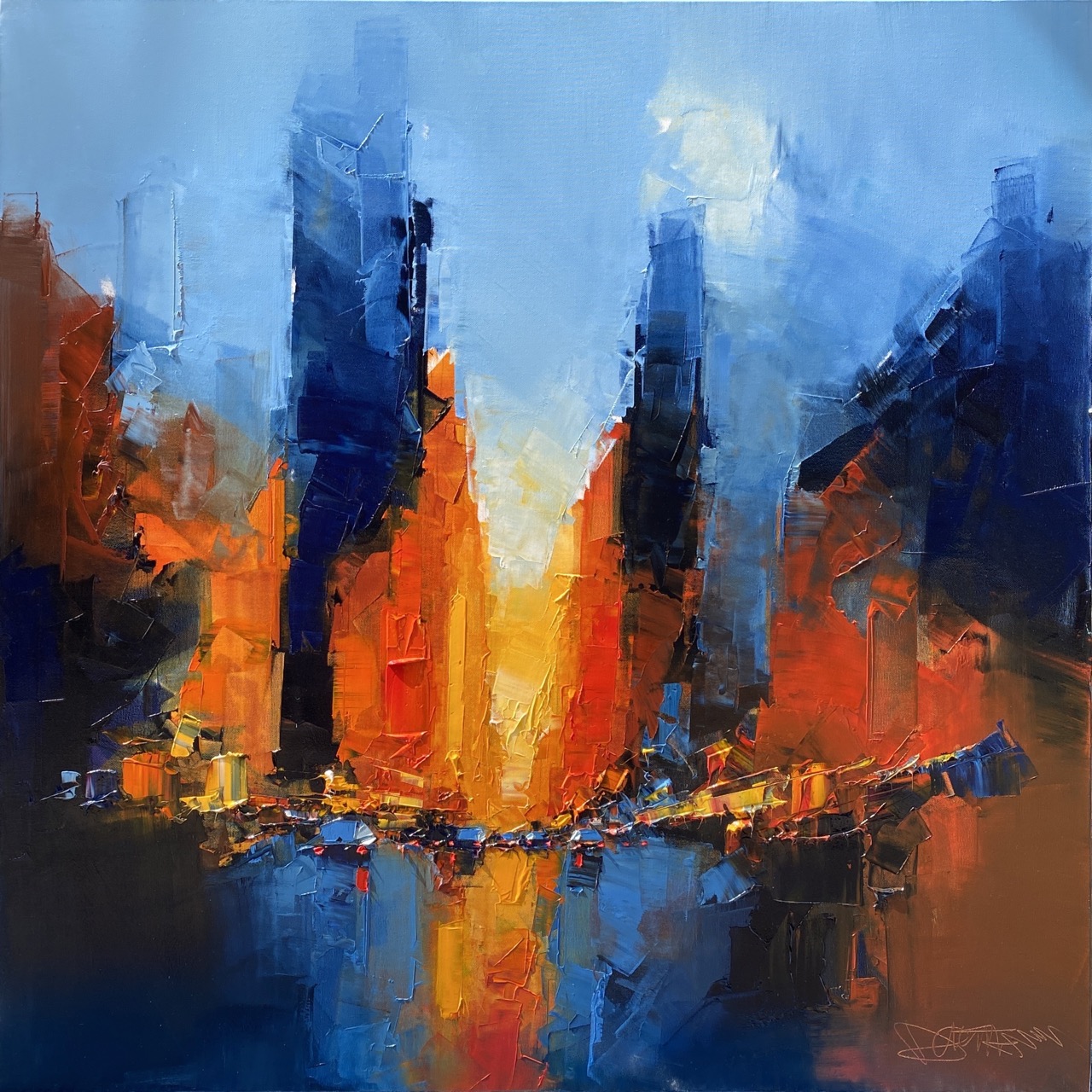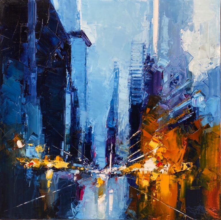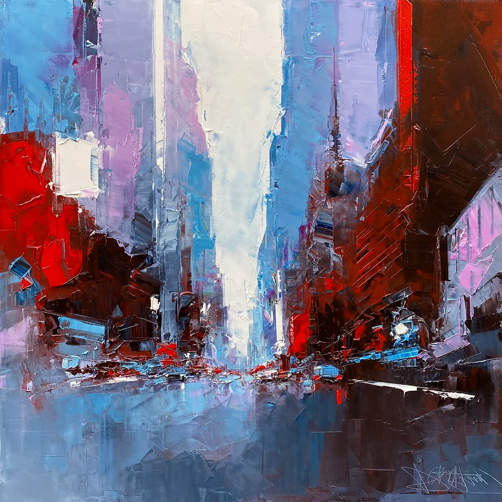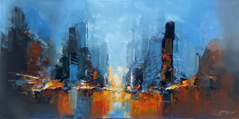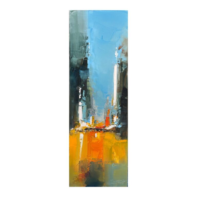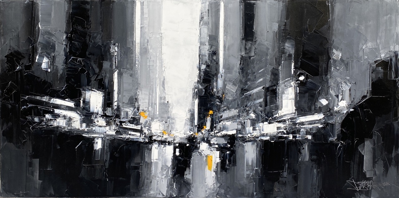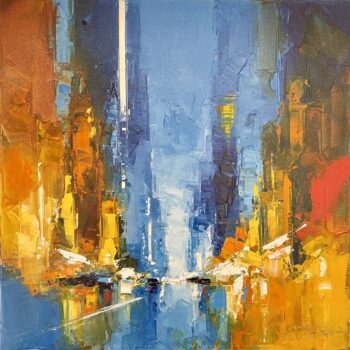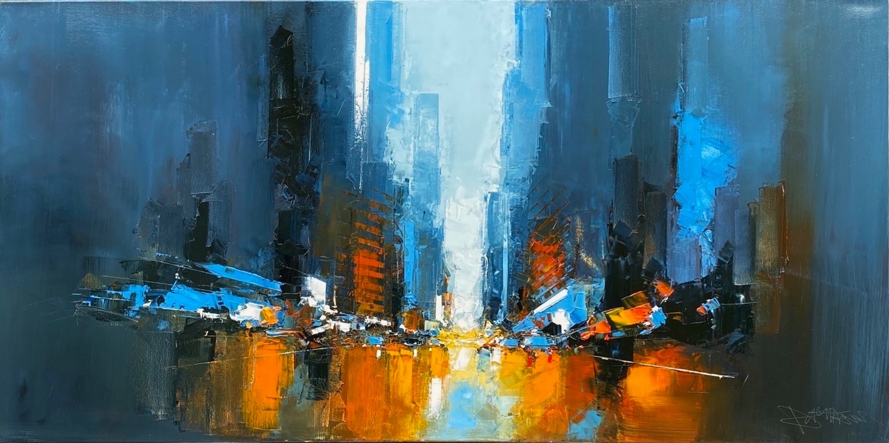 Daniel Castan a beaucoup voyagé à New York et à Hong Kong. Il en garde une fascination pour les univers urbains et leurs perspectives démesurées. Dans ses toiles, il recrée ces ambiances très graphiques. Les lignes des immeubles se perdent dans le ciel, les larges avenues semblent sans fin, les couleurs s’entrechoquent. Le couteau est l’outil de prédilection de l’artiste. Il lui permet de travailler à la fois en pâte, en large touche et de dessiner dans la matière.
