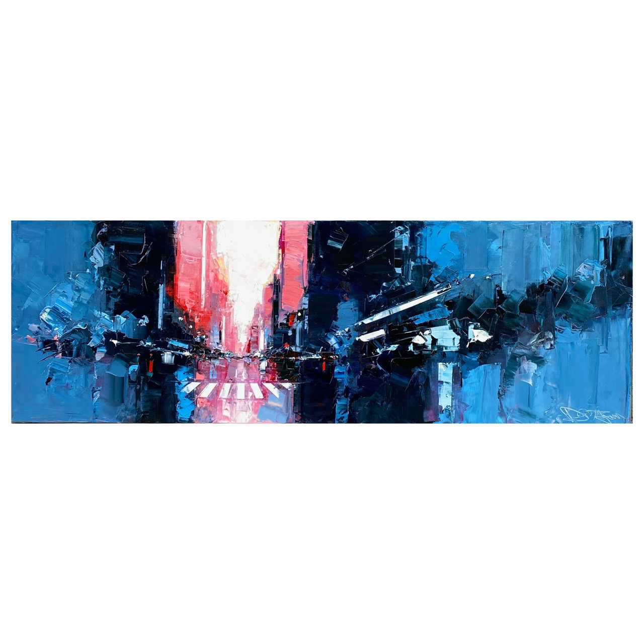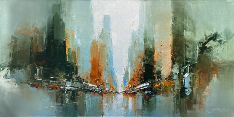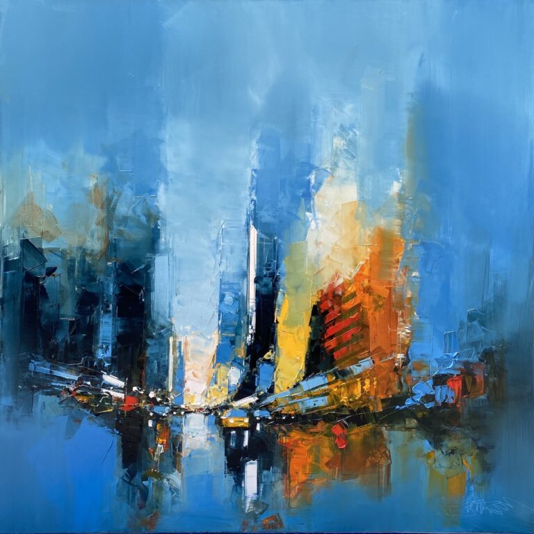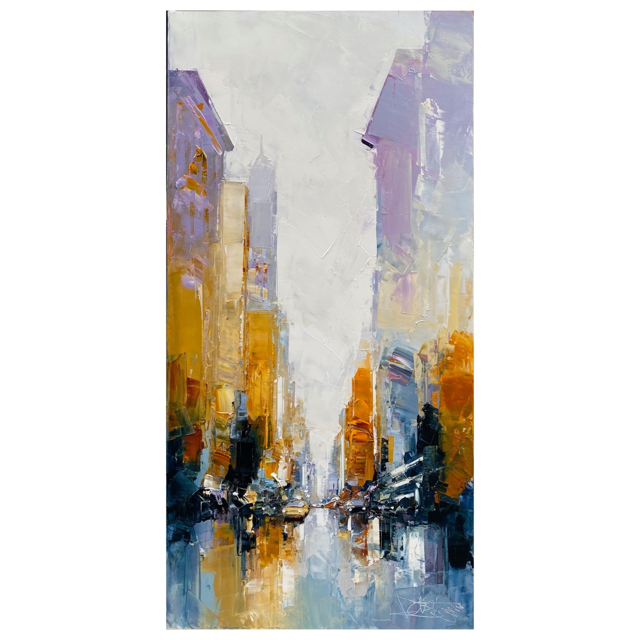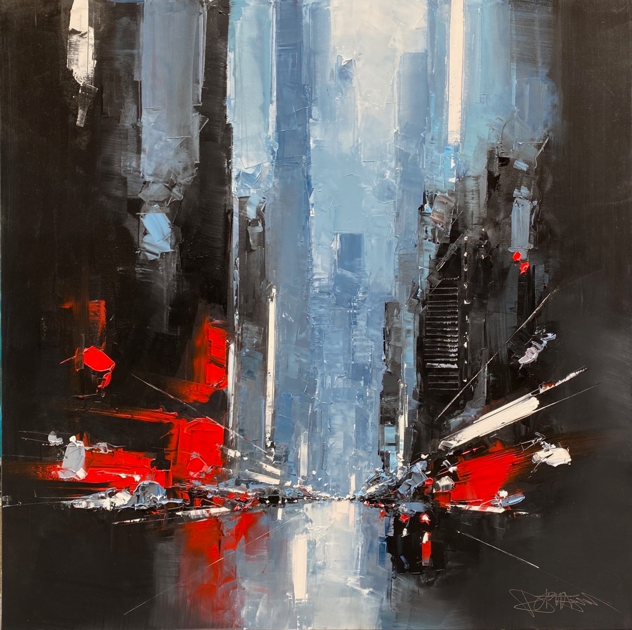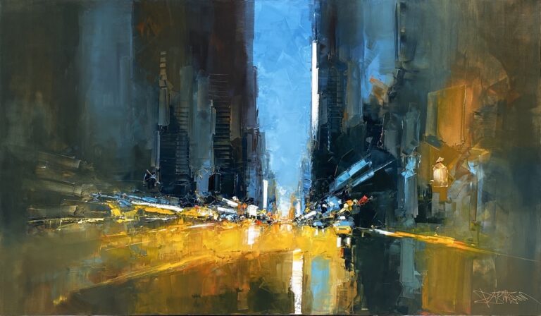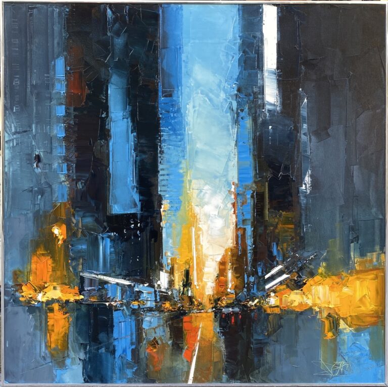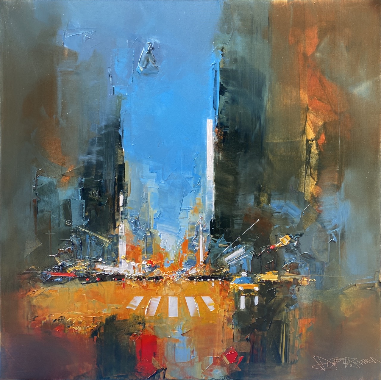 Daniel Castan a beaucoup voyagé à New York et à Hong Kong. Il en garde une fascination pour les univers urbains et leurs perspectives démesurées. Dans ses toiles, il recrée ces ambiances très graphiques. Les lignes des immeubles se perdent dans le ciel, les larges avenues semblent sans fin, les couleurs s’entrechoquent. Le couteau est l’outil de prédilection de l’artiste. Il lui permet de travailler à la fois en pâte, en large touche et de dessiner dans la matière.