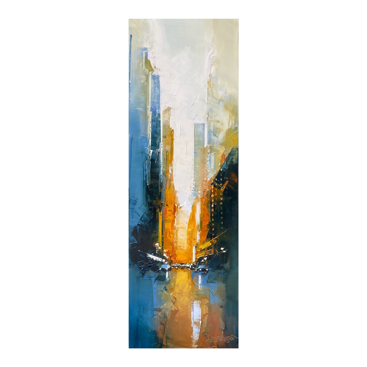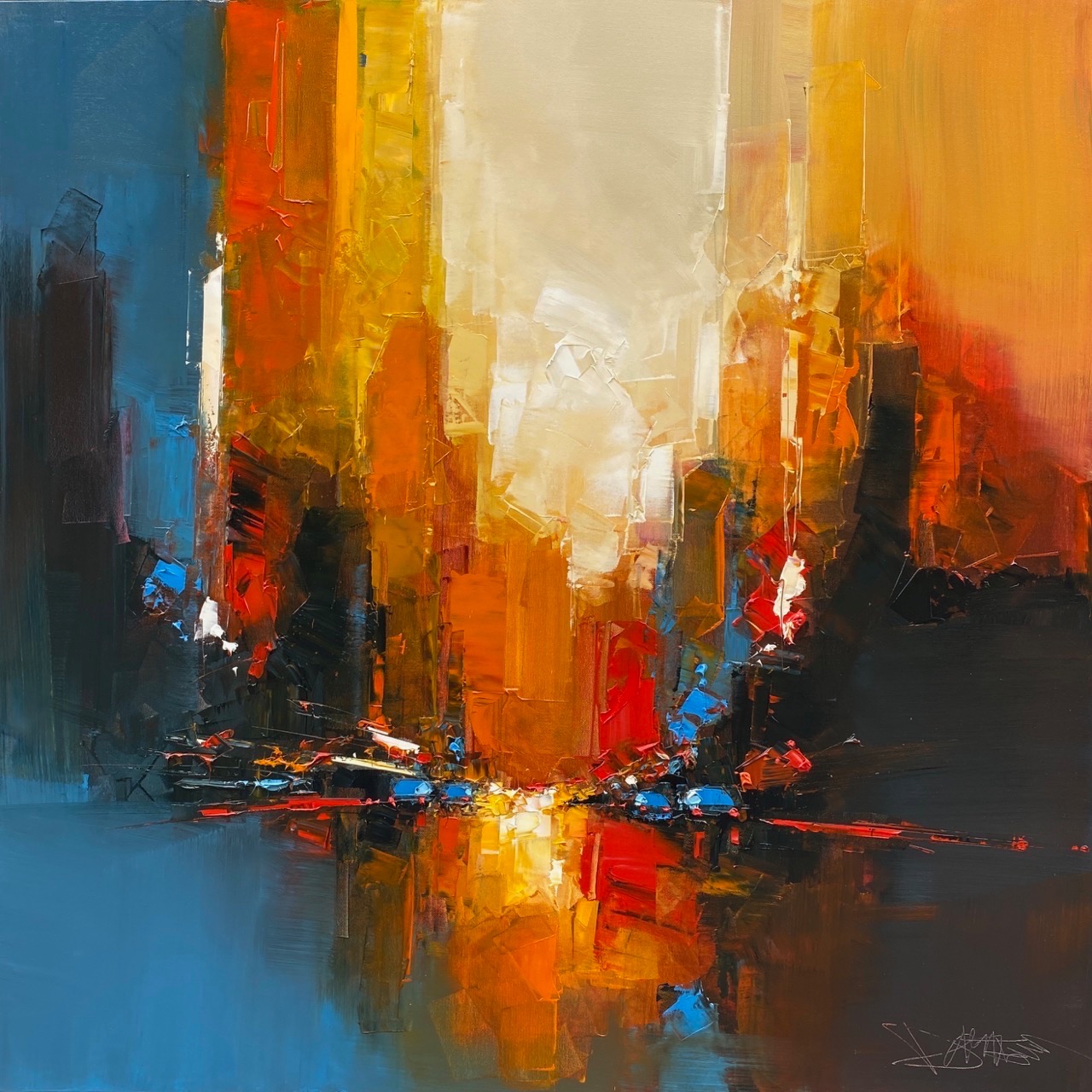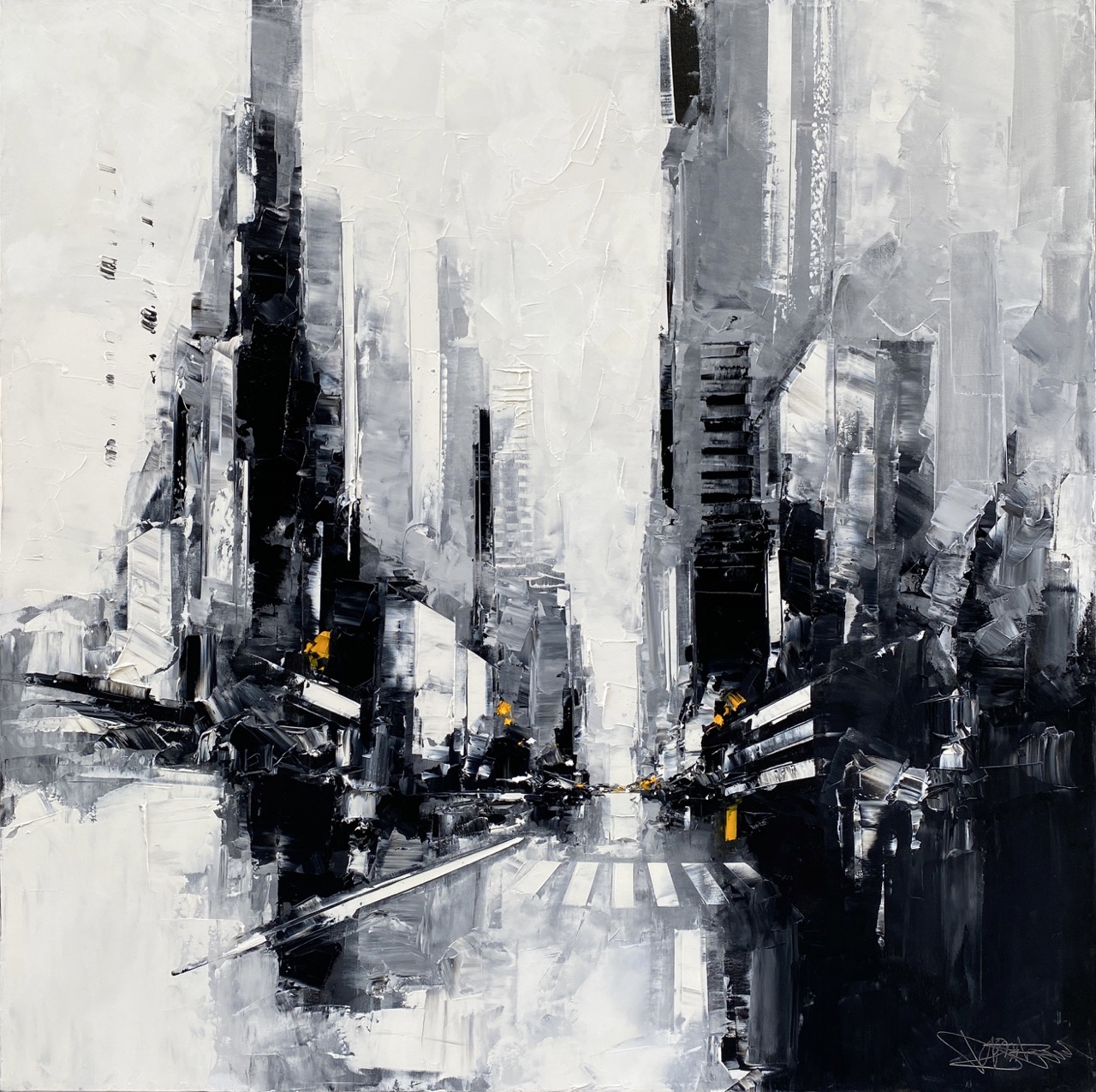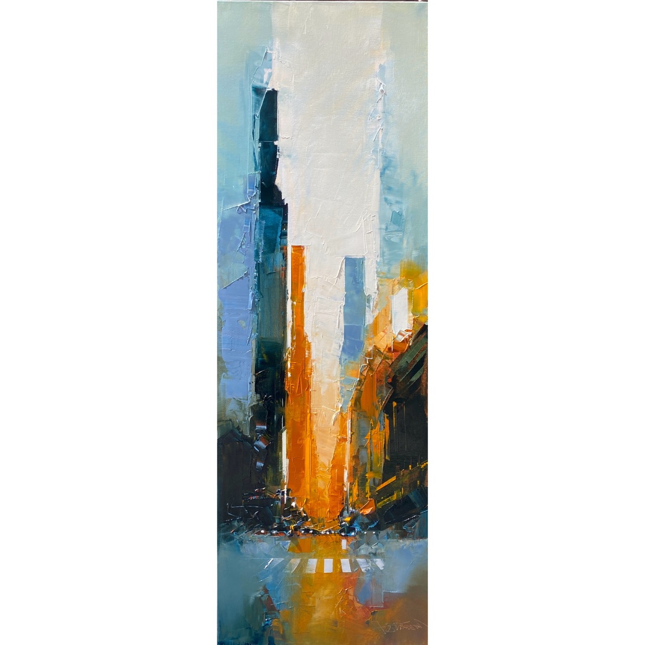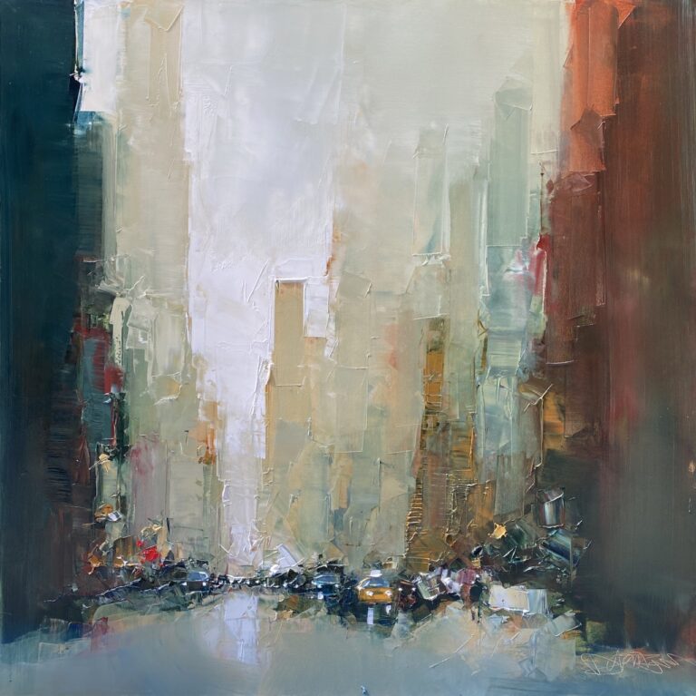 Daniel Castan a beaucoup voyagé à New York et à Hong Kong. Il en garde une fascination pour les univers urbains et leurs perspectives démesurées. Dans ses toiles, il recrée ces ambiances très graphiques. Les lignes des immeubles se perdent dans le ciel, les larges avenues semblent sans fin, les couleurs s’entrechoquent. Le couteau est l’outil de prédilection de l’artiste. Il lui permet de travailler à la fois en pâte, en large touche et de dessiner dans la matière.