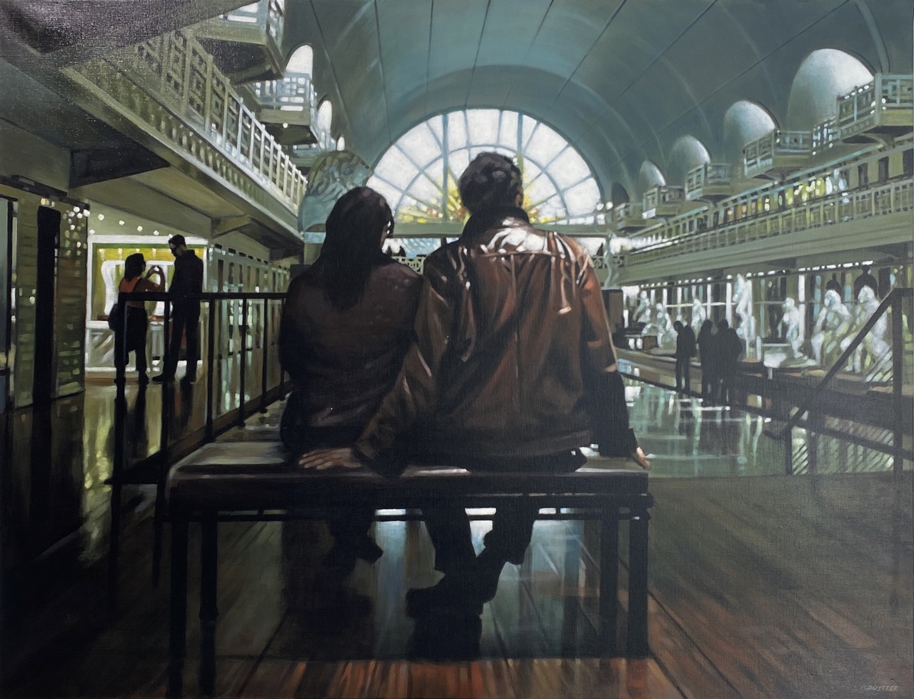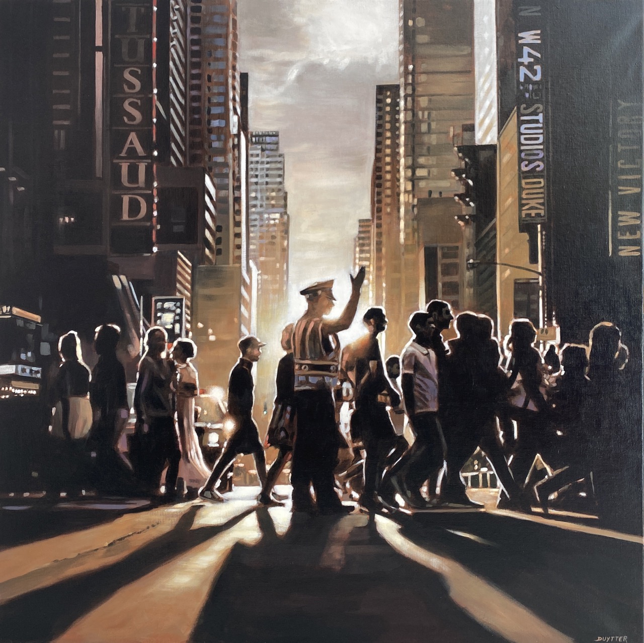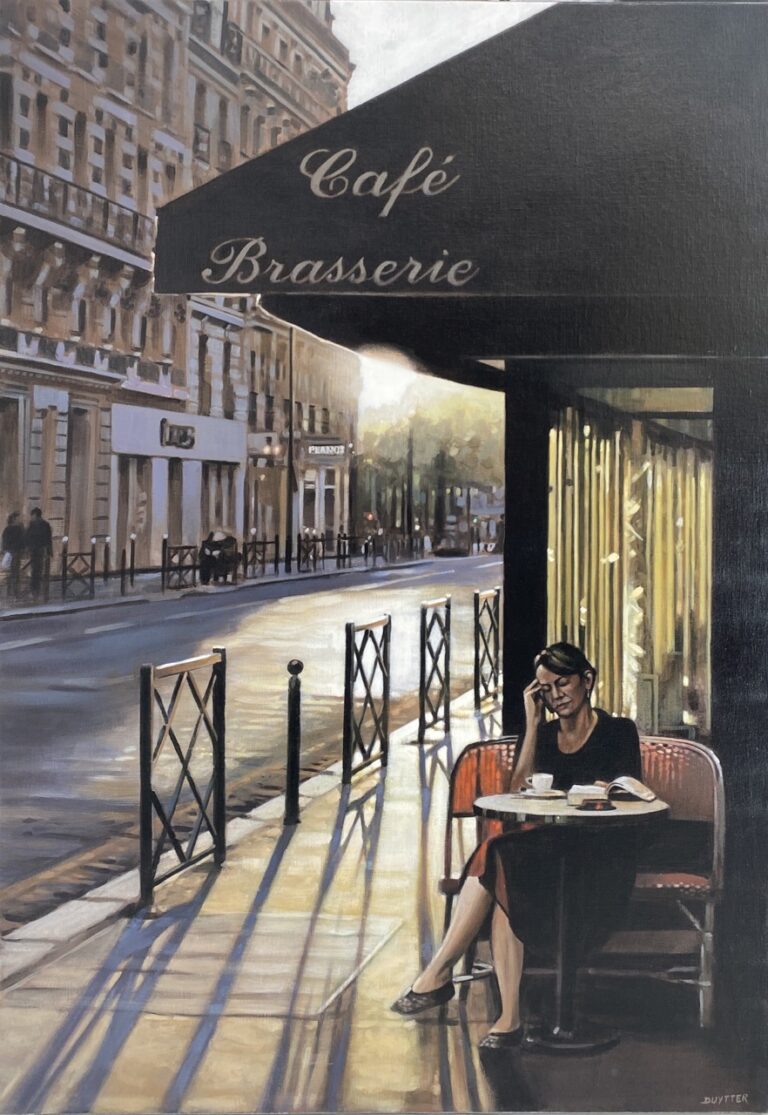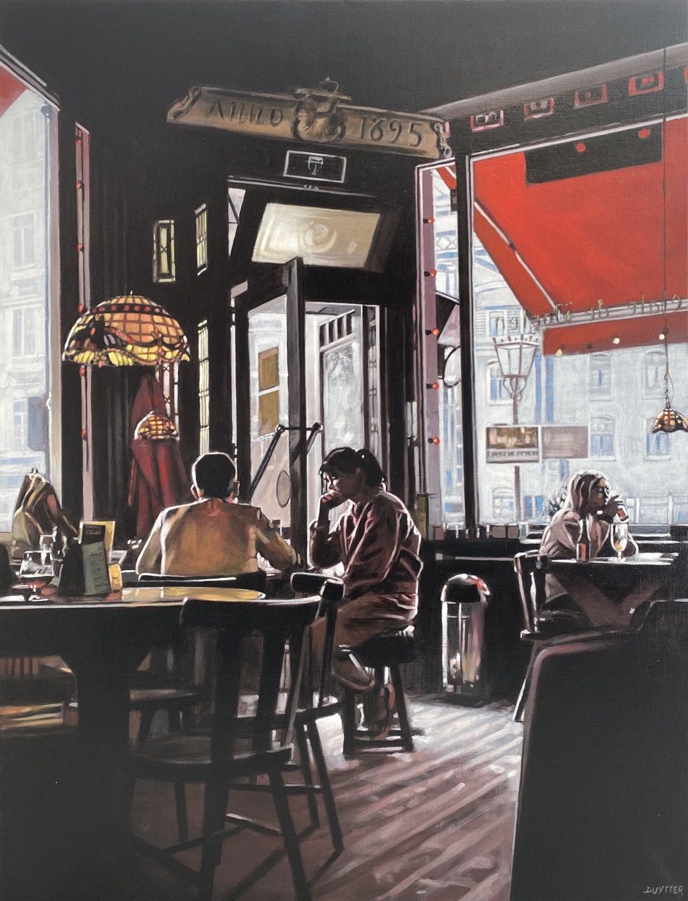 Face à une toile de Duytter, on ne peut s’empêcher de penser à Edward Hopper pour ses ambiances calmes et mélancoliques puis à Rembrandt, Le Caravage et Vermeer pour le traitement de la lumière.