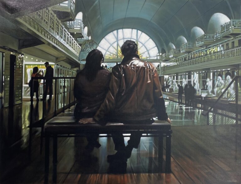On pourrait penser à de l’hyperréalisme si on regarde ses œuvres sans trop se rapprocher. Il n’en est rien même si la prouesse technique nous déroute pour nous emmener dans des scènes imaginaires. Car Duytter compose et transforme pour nous révéler sa vision, sa vérité sur le monde contemporain.