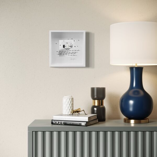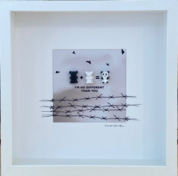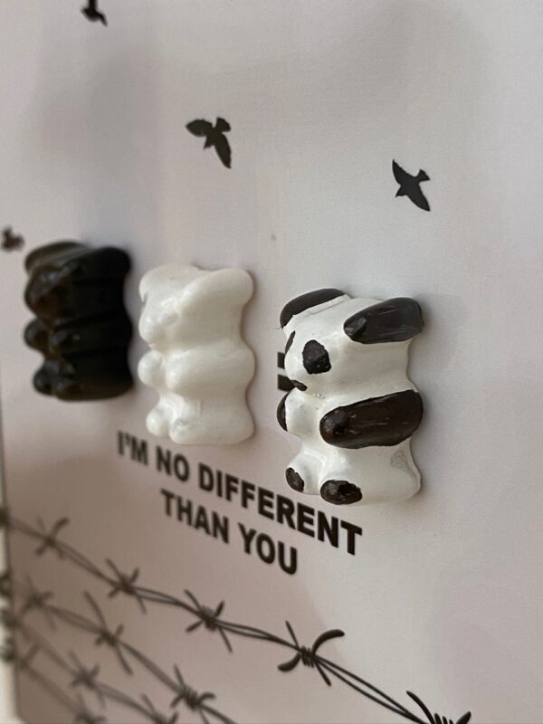 Assemblage sur papier photo brillant, collage sculpture en alliage aluminium et acier, ourson peint et vernis à la main.