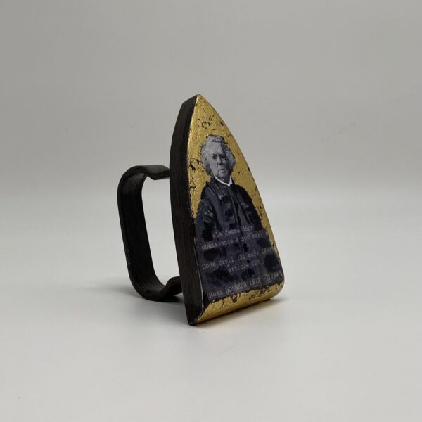 Transfert photo et collage de feuilles d’or sur fer à repasser en fonte du 19ième siècle
