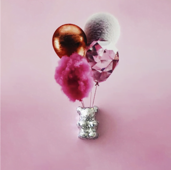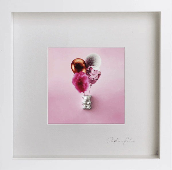 Assemblage sur papier photo brillant, collage sculpture en alliage aluminium et acier, ourson peint et vernis à la main.